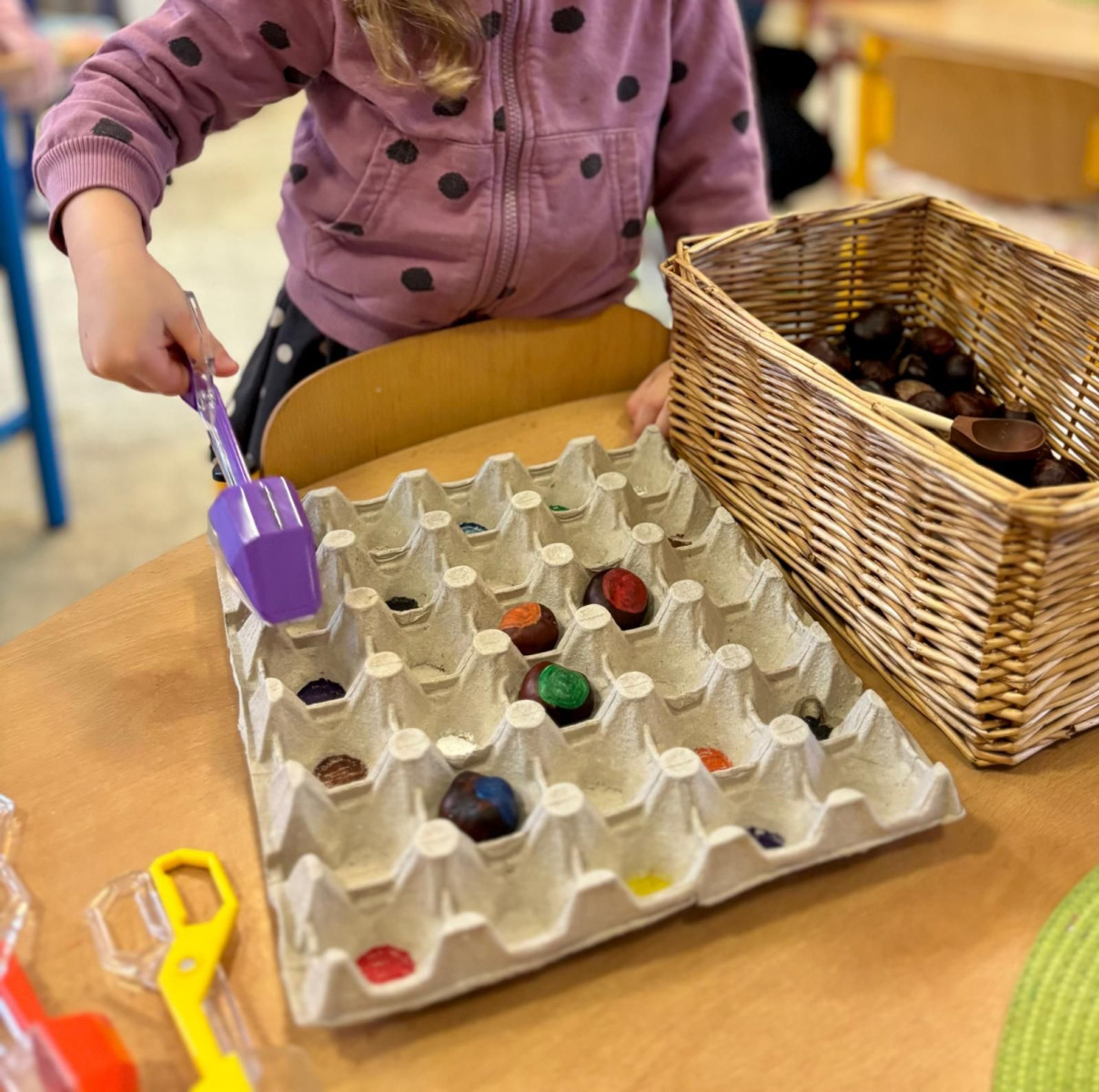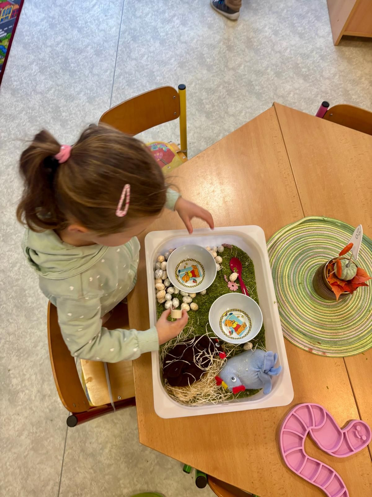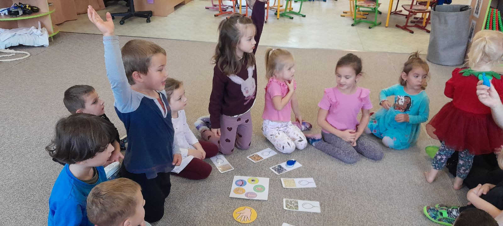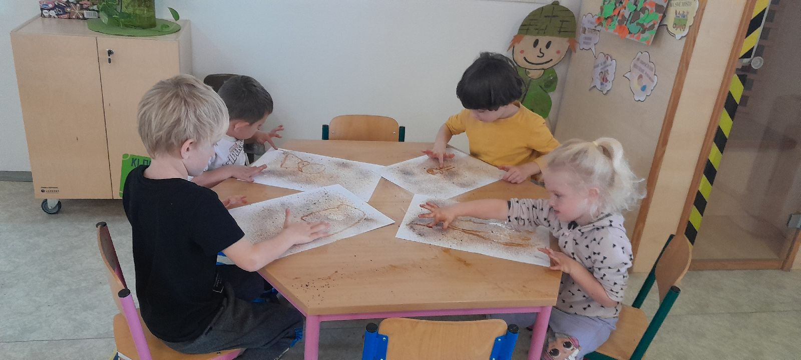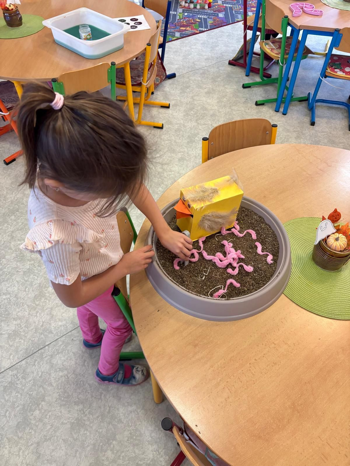 Minulý týden se díky Mgr. Lence Soukupové a „profesoru Kořínkovi“ naše školka proměnila v kouzelný les. Děti prožívaly každý okamžik naplno – zkoumaly, tvořily a objevovaly všemi smysly a při každé aktivitě bylo vidět jejich nadšení a zvědavost. Každý den jim přinesl spoustu možností experimentů a nových objevů. Rukama rozpouštěly kaštany v ledu a s úžasem sledovaly, jak se pomalu mění jejich tvary. S radostí tvořily kouzelné obrázky z kurkumy, míchaly barvy a objevovaly nové odstíny – smály se, když vznikly nečekané kombinace, a hned si je vzájemně ukazovaly. Hrály si s barevnou rýží, modelovaly ze studeného porcelánu a tvořily z přírodnin, které objevily venku i ve školce. Se zaujetím zkoumaly listy, větvičky a kamínky na light panelu i pod lupou, ohmatávaly každý detail a některé děti se do pozorování ponořily natolik, že by je bylo těžké vyrušit. Velkou radost jim přineslo malování do instantní kávy navlhčené rozprašovačem, které provonělo celou školku a vytvořilo příjemnou atmosféru.